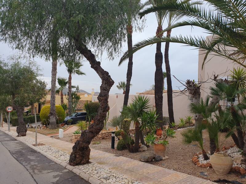 Weiter Richtung Murcia ändert die Landschaft sich wieder – weniger Orangenplantagen, eine zunehmend trockenere Landschaft, weiterhin immer mal wieder eine Palme und vor Allem viel rote Erde. Vorbei an Salzgewinnungsanlagen, Flamingos in flachem Gewässer… unpassend zur restlichen Umgebung. Unser Ziel befand sich südöstlich von Cartagena. Der empfohlene Stellplatz an der Küste mit direktem Meerblick, befand sich in einem überwachten Zipfel eines Caps. Als wir auf die Schranke, die der einzige Zugang zum Cap war, zufuhren, fragten wir uns erstmal, wie man denn nun zu dem Platz gelangen sollte. Dass diese Schranke jeden durchlässt und die Ankommenden einfach nur per Video erfasst, verstanden wir erst nach Beobachtung einiger anderer Autos. Eine voll überwachte Umgebung… da konnten wir ja nur sicher stehen. Das Cap war gespickt mit Villen und den tollsten dazugehörigen Gärten. Dieses Mal fand man darin neben Palmen sogar einige Kakteen, was die Gegend umso exotischer wirken ließ.