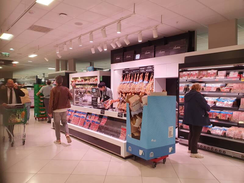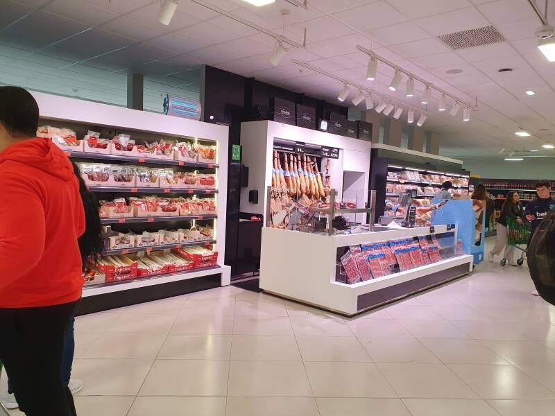 Auf unserer Weiterreise nach Figuera da Foz hielten wir im Supermarkt Mercadona an - eine spanische Kette, die es vorrangig in Spanien, aber auch in Portugal gibt. Wieso wir das erwähnen? Wir hatten dort ein kleines Schinkentasting. In jedem Mercadona gibt es eine extra Schinkentheke, an der die Scheiben drei verschiedener Qualitätsstufen, frisch von den gereift, gepökelt und getrockneten Schweinsfüßen, heruntergeschnitten werden. Der nette Verkäufer lies uns von jeder Sorte probieren und erläuterte auch noch in gutem Englisch die Unterschiede. Die einfachste und günstigste Sorte nennt sich Reserva und ist nur kurz gereift. Die nächste Qualitätsstufe besteht zu aus 50 % aus dem Iberico Schwein, das geschmacklich nochmal besser ist. Die hochwertigste Sorte ist ein reines schwarzes Iberico Schwein, dass zudem auch nochmal besser gehalten und gefüttert wurde. Diese Sorte schmeckt am Intensivsten und wird pur zu Tapas empfohlen. Aufs Brot legen oder in Öl tunken ist hier Frevel. Man legt dafür auch stolze 50 € pro Kilogramm hin. Wir entschieden uns am Ende für die mittlere Qualität, wobei wir inzwischen auch sagen müssen, dass uns der Reserva komplett ausreicht. Dieser schmeckt ebenfalls super und ist mit 22 € pro Kilogramm total im Rahmen. Diesen kann man ohne schlechtes Gewissen auch mal auf das Brot zusammen mit Käse packen oder sogar für Datteln im "Schinkenmantel" verwenden. Normal handelt es sich hierbei um Datteln im "Speckmantel", aber wir fanden den Schinken einfach klasse dafür. Probiert es gerne selbst und schaut euch das komplette Tapasteller Rezept dazu an --> Link.
