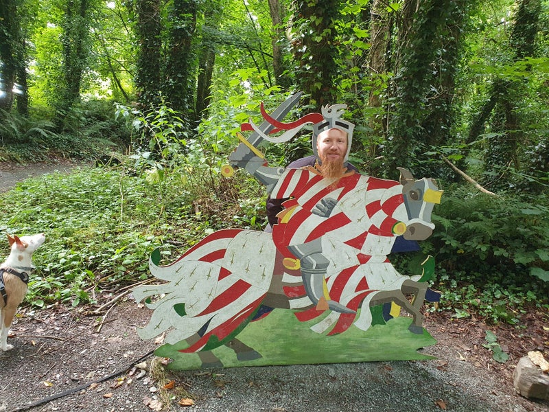 Dann trafen sie auf ein Pferd. Es stand in seiner rot-weißen Rüstung da und lud zum Kampf ein. Einer der Reisenden kletterte darauf und ritt eine Runde durch den Wald - was ein Spaß! So musste es sich vor 800 Jahren angefühlt haben.