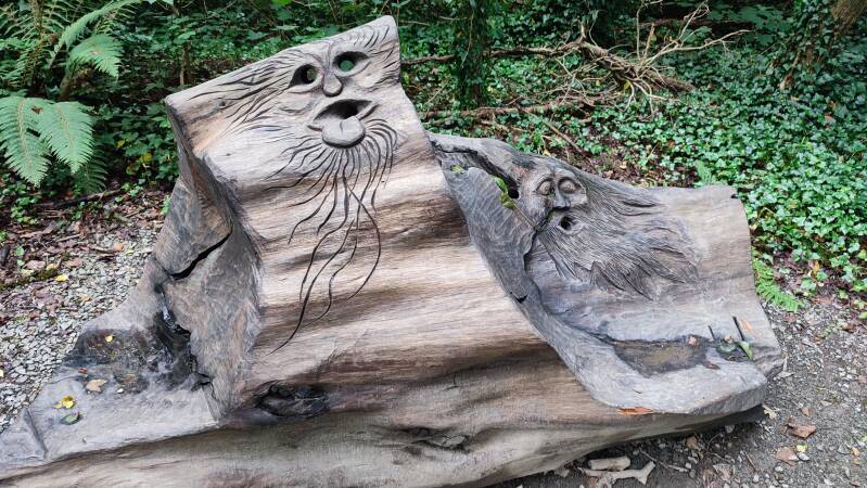 Nachdem sie irgendwann feststellten, dass sie im Kreis liefen, hielten sie bei der Schnitzerei eines halben Frauengesichts an. Verzweifelt baten sie das tote Holz darum ihnen den Weg zurück zur Klosterruine zu weisen, denn von da aus würden sie den Ausgang leicht wieder finden. Tatsächlich blinzelte die Frau plötzlich und formte mit ihren Lippen Worte, die nur mit Lippenlesen übersetzt werden konnten. "Fluss, zwei, West, Labyrinth"- so waren ihre Worte. Daraus leiteten die cleveren Reisenden ab, dass sie zunächst zwei Kilometer am Fluss entlang laufen mussten, dann westlich in einen Weg einbiegen sollten und an dessen Ende auf ein Labyrinth stoßen würden. Vermutlich lag am Ende des Labyrinths dann die Klosterruine.