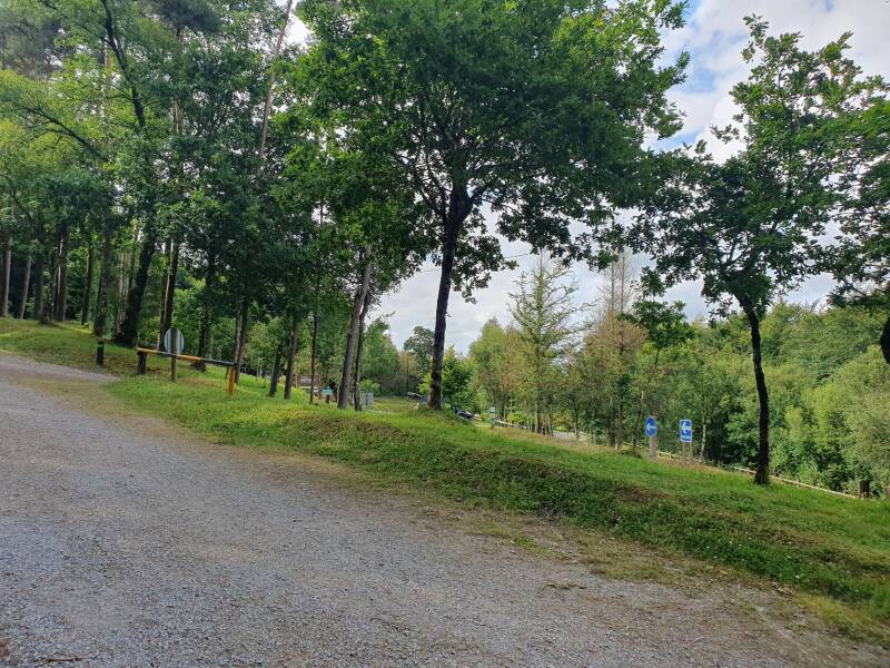 Als wir dann das Gelände abliefen und die Strecken checkten, fanden wir sämtliche Hundeverbotsschilder für die MTB Strecken. Der Streckenplan gefiel uns auch nicht so recht, denn es gab kaum eine MTB Runde unter zehn km. Zudem man zunächst nur über die einfachen (blauen) Strecken fahren musste, um überhaupt zu den schwereren Strecken (den roten und schwarzen) zu gelangen. Unsere Tour würde demnach ziemlich lang werden und das ohne E-Bike. Zudem wir den Kleinen nicht mitnehmen konnten und er heute noch zu unausgelastet war, um alleine im Auto zu bleiben. Übernachten durfte man auf dem Platz auch nicht und rundherum war kein vernünftiger Stellplatz für die Nacht zu finden. Wir waren unentschlossen was wir tun sollten. Etwas ärgerten wir uns darüber einfach bezahlt zu haben und hineingefahren zu sein, ohne vorher zu wissen, ob es Sinn machte. Man hätte an der Straße davor auch nicht wirklich zwischenparken können. Wir entschieden uns dafür erstmal auf einem der drei Wanderwege, die ebenfalls in den Mountains und dort ausgeschildert waren, spazieren zu gehen. Der Naturpfad führte fünf km und 260 Höhenmeter durch den Wald. Dabei kamen wir an einigen MTB Trail Ein- & Ausgängen vorbei und konnten uns die Streckeneingänge anschauen. Tatsächlich hätte es wenig Spaß gemacht den blauen Trail zu fahren, so unser Urteil. Die schwarzen Strecken sahen am Einstieg schon anspruchsvoller aus. Allerdings wussten wir nicht wie sie sich im weiteren Verlauf entwickelten. Über eine Trimmdich Strecke mit natürlichen Sportgeräten und einem tollen Ausblick auf die umliegende Landschaft, ging es schließlich zurück zum Bulli. Die kleine Wanderung war nichts Besonderes, jedoch ganz hübsch gewesen und hatte wenigstens den Kleinen ein wenig ausgepowert, da er zeitweise frei flitzen durfte.