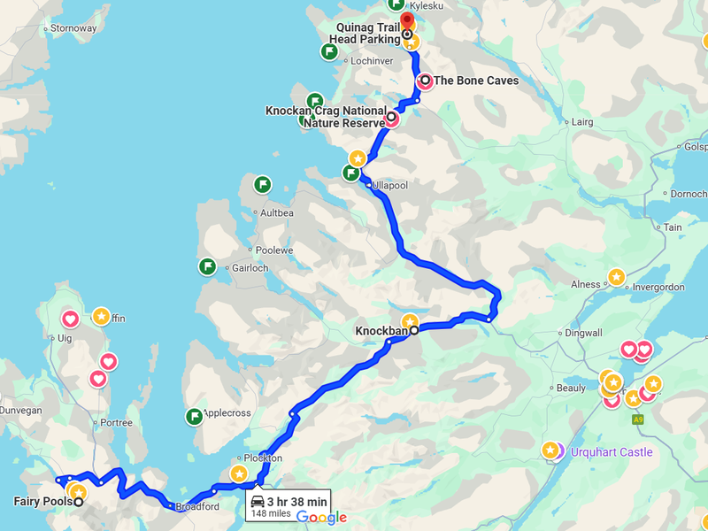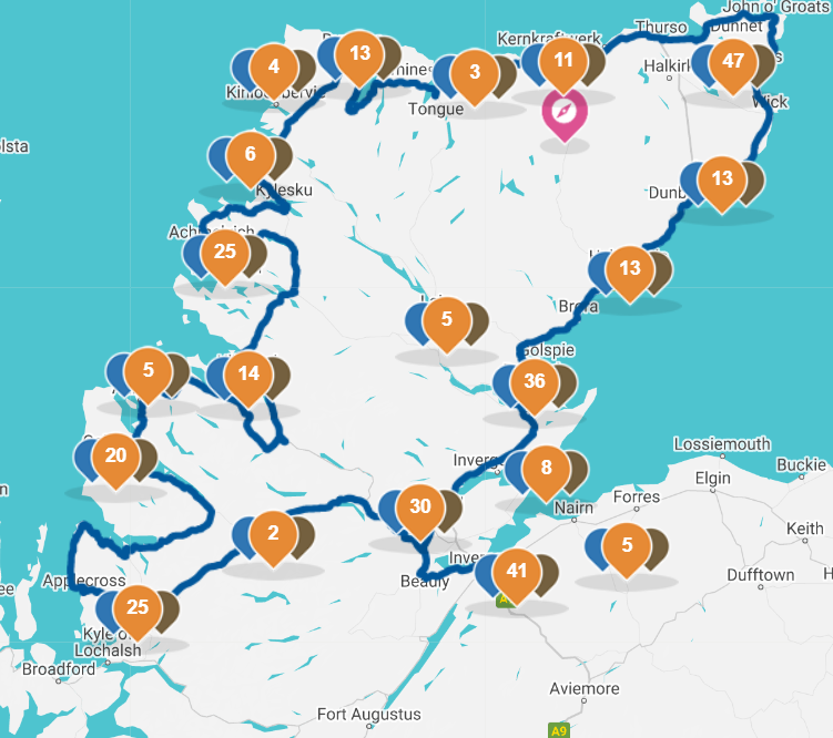 Nachdem wir die Insel Skye verlassen hatten und auf der Fahrt in den Norden Schottlands waren, wurde die Landschaft immer mehr von Heidenkraut durchzogen. Dabei fuhren wir fast durchgängig auf der NC (North Coast) 500 entlang, die 825 Kilometer lang ist und eine der schönsten Küstenstraßen der Welt sein soll. Die Straße startet in Inverness, verläuft über den Westen bei Applecross in den Norden hinauf, dort an der Küste entlang bis John O' Groats im Nordosten, um abschließend wieder nach Süden in Inverness zu enden. Ganz Nordschottland wird somit von der NC 500 umrundet.