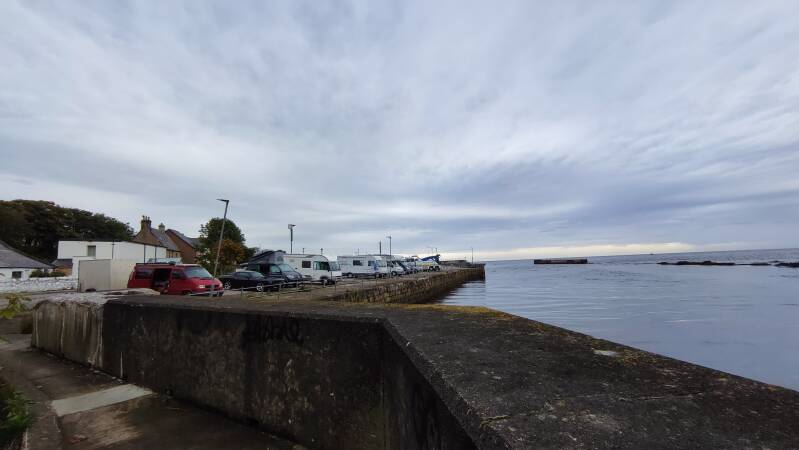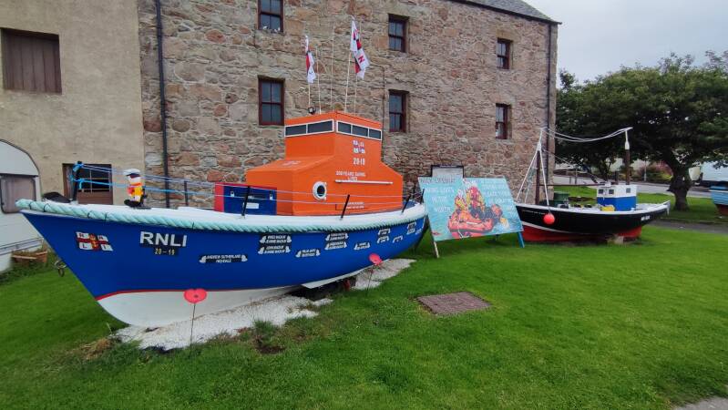 Danach fuhren wir ca. 1,5 Stunden weiter nach Helmsdale. Die Landschaft blieb weiterhin flach und von Landwirtschaft durchzogen. Sogar einige Hochlandrinder sahen wir dort stehen. Zunächst steuerten wir in Helmsdale das Hotel an, in dem Danea sich eingebucht hatte. Sie wollte sich zeitweise mal etwas Luxus gönnen, in diesem doch sehr einfachen Urlaub. Wir durften zum Kochen auf dem Hotelparkplatz stehen bleiben und konnten so noch gemütlich zusammen essen. Danach ließen wir Danea beim Hotel zurück und suchten uns einen Stellplatz am Hafen von Helmsdale. Es war schon spät und die Dunkelheit war hereingebrochen und so war es pures Glück, dass noch genau ein freier Parkplatz für uns vorhanden war. Wir gönnten uns auch noch etwas Luxus und nutzten die öffentlichen Duschen, die sich direkt um die Ecke befanden. Für nur einen Pfund konnte man dort fünf Minuten lang duschen. Auf dem Rückweg zum Bulli schlenderten wir noch ein bisschen am Hafen entlang und bewunderten die vielen Figuren von Schiffen und Hunden aus Holz, die dort aufgestellt worden waren. Des Weiteren hing noch eine Spendenbox dort, die es jedem der hier übernachtete freistellte etwas zu spenden. Der Erlös käme der Seerettung zu Gute. Das fanden wir eine super Sache. Wir hatten solch ein Konzept nun schon öfter in Schottland vorgefunden und begrüßten es voll und ganz.
