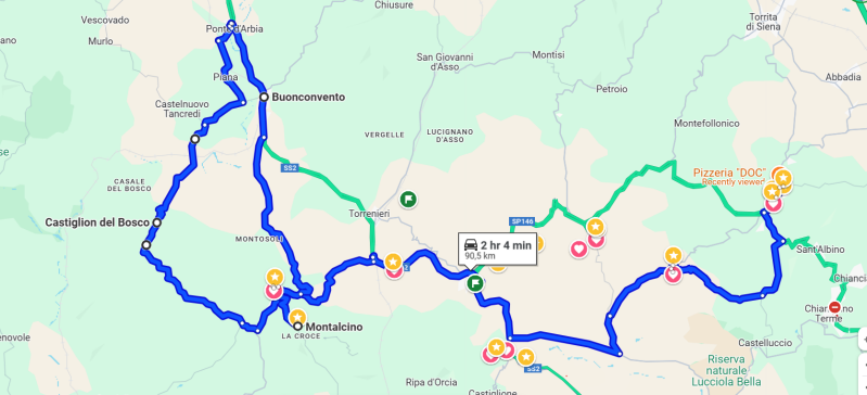 Gegen 14 Uhr waren wir startklar und hatten somit noch zwei Stunden Zeit bis zur einbrechenden Dämmerung. Mit Google planten wir eine Rundtour die zunächst über kleinere kurvenreichere Wege nach Castiglion del Bosco führte und von dort aus über Buonconvento wieder gen Süden nach Montalcino. Die Route wurde wieder zur Offroad Action für uns, da die Straße nach Castiglion del Bosco in unseren Augen keine Straße war, sondern eher ein staubiger, fein geschotterter Feldweg. Dazu hatte sie etliche Löcher und Bodenwellen. Mit dem Bulli hätten wir geflucht, so aber machte es mit unseren Enduro Maschinen sogar noch Spaß. In Montalcino angekommen parkten wir unsere Mopeds außerhalb der Altstadt. Motorradfahrer zahlten keine Parkgebühren - es war demnach eine gute Entscheidung gewesen nicht mit dem Bulli herzukommen, zumal die Parkplätze nicht wirklich für große oder lange Camper ausgelegt waren. Als wir zu Fuß den hübschen kleinen Ort erkundeten, fiel uns auf, dass ein Event stattfinden musste. Überall liefen Menschen mit Weingläsern und Flaschen in der Hand umher. Sämtliche Weinbars waren geöffnet und Menschen standen in den Eingängen. Dann erinnerten wir uns daran, dass der Besitzer des Weinguts zu uns gesagt hatte, sie seien heute auf einer Veranstaltung die mit dem bekanntesten Wein von Montalcino zu tun hatte - dem Brunello di Montalcino. Vermutlich handelte es sich hierbei um besagtes Event. Zu schade, dass wir keinen Wein trinken durften da wir mit den Mopeds da waren, da sind wir konsequent. Dafür gönnten wir uns einen italienischen Espresso aus der Siebträgermaschine. Vorbei an den zwei mittelalterlichen Geschwistertürmen gingen wir schließlich noch kurz in die Fortezza di Montalcino. Den Innenhof konnte man sogar noch umsonst besuchen. Von dort aus hatte man einen tollen Ausblick auf die Umgebung jenseits der Stadtmauern. Ein großes bewaldetes Gebiet erstreckte sich vor uns und erinnerte uns sehr an den Pfälzer Wald in der Heimat. Ein Fußballplatz befand sich direkt neben der Fortezza und so saßen ein paar Menschen auf den niedrigeren Mauern des Innenhofes, die zum Stadion zeigten, und schauten sich das laufende Fußballspiel an. Das hatte irgendwie Charme und passte zu bella Italia.